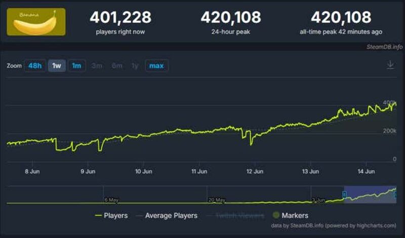 The game—such as it is—originally launched in April, and no one noticed. By mid-May a few people started paying attention, but in the last week that number has shot up to see Banana sitting high on the Steam charts, and seemingly only going up. And this implausible success is leading to conspiratorial claims and furious Steam reviews decrying its cynical attempts to [clutch petticoat] make money.